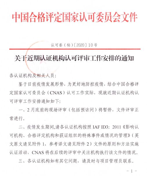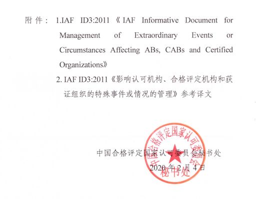 2月底前的CNAS现场评审(包括预访问)将暂停,文件评审正常进行时间:2020-02-05 认可委官方链接:https://www.cnas.org.cn/zxtz/901924.shtml 本来1 昨日,中国合格评定国家认可委员会(CNAS)发布关于近期认证机构认可评审工作安排的通知。据该通知,2月底前的现场评审(包括预访问)将暂停,文件评审正常进行。通知如下: IAF ID3:2011:译文 0.引言 在正常的商业环境中,每个组织都不断面临机遇、挑战和风险。然而,组织无法控制的特殊事件或情况会总会发生。在这种情况下,ABs(认可机构)和CABs(合格评定机构)宜根据本文件中概述的指南,制定适当的维护认可和认证的流程。 对于AB(认可机构)和CAB(合格评定机构)来说,能够证明以下事项是重要的 l 展示合理的尽职调查、相互理解和信任 l 建立适当的行动计划(进程)以应对非常事件 该文件的目的是为ABs和CABs提供适当行动计划(进程)的指南。 该信息性文件无意覆盖认证标准或认证制度中的要求。如果一项标准或制度无论发生何种危机都不能提供灵活性的解决方案,那么认证机构则只能从相关认可机构或制度所有者那里寻求指南并商定行动路线。 1.范围 该信息类文件主要适用于管理体系认证。 2.定义: 2.1特殊事件或情况:组织无法控制的情况,通常称为“不可抗力”或“天灾”。例如战争、罢工、暴乱、政治不稳定、地缘政治紧张、恐怖主义、犯罪、流行病、洪水、地震、恶意的计算机黑客攻击、其他自然或人为灾难。 3. 影响获证组织的特殊事件或情况 影响获证组织或认证机构的特殊事件可能会暂时阻止认证机构计划实施的现场审核。当这种情况发生时,依据标准或法规文件的运作要求,认可机构(ABs)和合格评定机构(CABs)需要建立(经过与获证组织协商)合理的行动方案。 合格评定机构(CAB)宜评审持续认证的风险,并建立文件化的方针和流程,说明在认证组织受到异常事件影响时将采取的步骤。 合格评定机构(CAB)制定的方针和流程宜确定评审获证组织当前和预期未来状况的方法,并确定替代性的潜在短期评审组织的方法,以验证其管理体系的持续有效性。 为了使合格评定机构(CAB)能够评价持续认证的风险,并了解获认证组织当前和预期的未来情况,合格评定机构(CAB)宜在决定适当的行动方案之前,从获证组织处收集必要的信息。适用时,合格评定机构(CAB)收集的信息宜包括以下内容: l 组织何时能够正常运作? l 组织何时能够运送产品或执行当前认证范围内确认的服务? l 组织是否需要使用替代的制造和/或分销现场?如果是,这些现场目前是否包含在当前认证范围中,或者是否需要接受评价? l 现有库存是否仍然符合客户的规格,或者获证组织是否将就可能的让步与其客户进行联系? l 如果组织获得认证的管理体系要求组织实施灾难恢复计划或应急响应计划,获证组织是否实施了该计划,该计划是否有效? l 获证组织是否会将某些流程和/或服务或装运的产品分包给其他组织?如果是,获证组织将如何控制其他组织的活动? l 管理体系的运行受到何种程度的影响? l 获认证组织是否进行了影响评价? l 适当时,确定可以替代的抽样地点。 如果持续认证的风险较低,并且基于收集到的信息,合格评定机构(CABs)可能需要考虑替代的短期评审方法,以验证组织的管理体系的持续有效性。这可能包括要求组织提供相关文件(例如,管理评审会议记录、纠正措施记录、内审结果记录、检测/检验报告等)。由合格评定机构(CABs)实施非现场的审查,以确定认证的持续适宜性(仅短期)。该流程至少宜关注以下事项: l 受影响的认证组织和合格评定机构之间的主动沟通; l 合格评定机构与受影响的组织就评审的步骤和如何推进计划进行沟通;; l 规定在暂停或撤销认证前可替代使用的短期评审方法的最长时间; l 恢复正常监督的标准,包括任何恢复审核的方法和时机选择; l 根据合格评定机构的程序,在个案分析的基础上对组织的监督计划进行可能的修订; l 确保任何偏离认可要求和合格评定机构程序的行为都有合理性解释,形成文件,并与认可机构(AB)就解决临时偏离要求的计划达成一致; l 当重新进入受影响的地点时,根据合格评定机构的监督计划重新建立监督/再认证活动。 如果无法与组织取得联系,合格评定机构(CAB)宜遵循暂停和撤销认证的正常流程和程序。 在制定替代性短期评审方法时,合格机构(CAB)宜考虑以下限制: a )第一次监督审核 通常,初次认证后的第一次监督审核将在第二阶段审核的最后一天的12个月内进行(17021的2011版9.3.2.2条款。但是,如果已经如上所述收集了足够的证据,为了对获认证的管理体系的有效性保持信心,认证机构可以考虑将第一次监督推迟一段时间,通常不超过6个月的时间(从初次认证之日起18个月)。 否则,证书必须暂停或缩小认证范围。 b) 后续监督审核 在特定情况下,合格评定机构可以调整后续监督审核的时间。如果一个组织必须在一段有限的时间内(少于6个月)完全关闭,合格评定机构推迟原定在关闭期间进行的审核,直到该组织恢复运营,这是合理的。当运营活动恢复时,组织宜通知合格评定机构,以便机构能够迅速安排审核。 c)再认证审核 通常情况下,为避免认证失效,再认证审核和再认证决定必须在到期前完成。(ISO/IEC17021:2011, 9.1.1.2)。然而,如果已经如上所述收集了足够的证据,对获认证的管理体系的有效性提供了信心,可以
